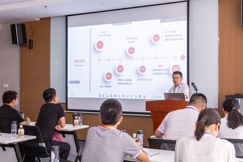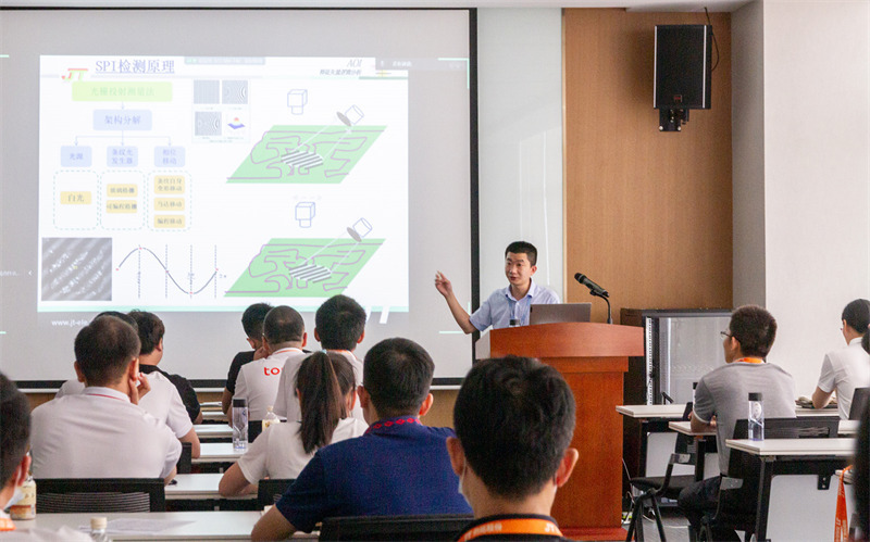 视觉客户服务负责人贺成群重点介绍劲拓视觉检测设备特色和产品优势。劲拓检测设备核心部件全部采用知名品牌,拥有先进的制造工艺和质检工艺,可达到高精度、统一性、高稳定性的检测要求。同时采用多光谱可编程光源解决视觉工艺难点。产品软件自主研发,配备ai算法及自动编程,有编程快、检出高、误报低、易学习的显著特点。
